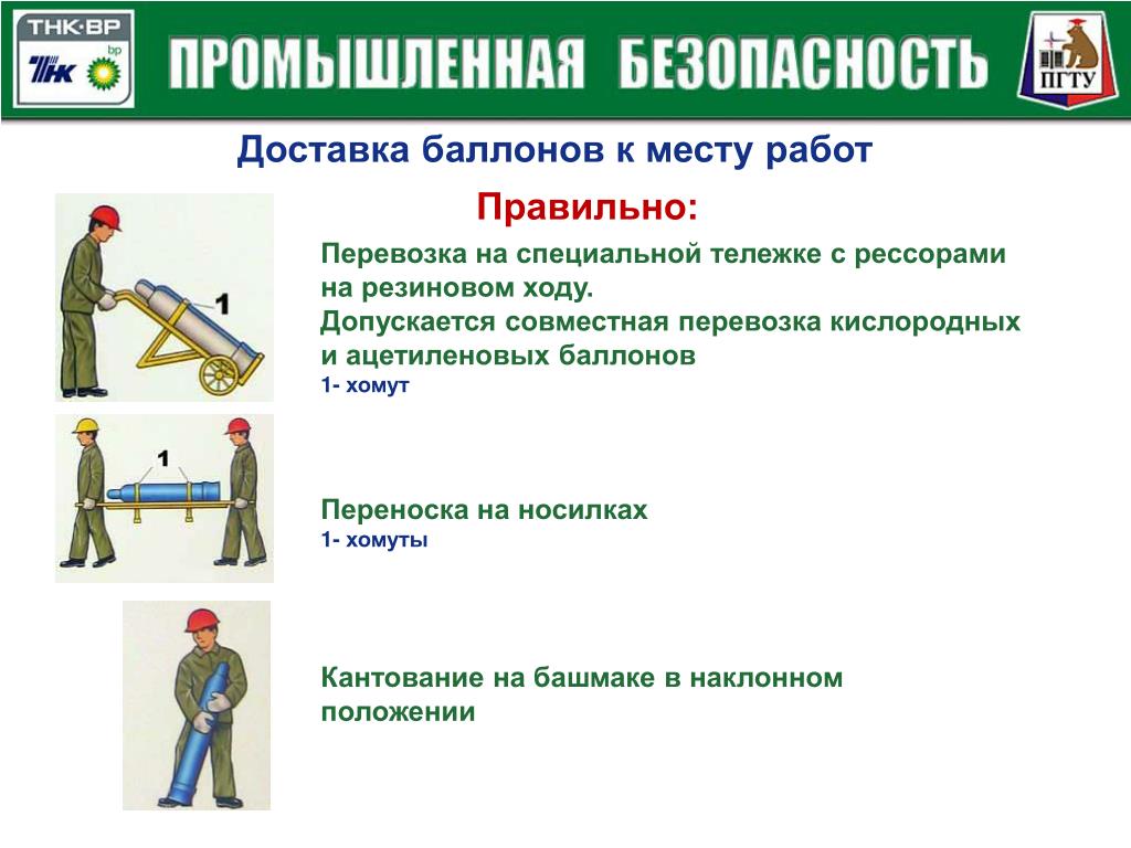 При погрузке или выгрузке запрещается: Работать в промасленной одежде, рукавицах со следами масла, жира Грузить и выгружать баллоны без колпаков и заглушек