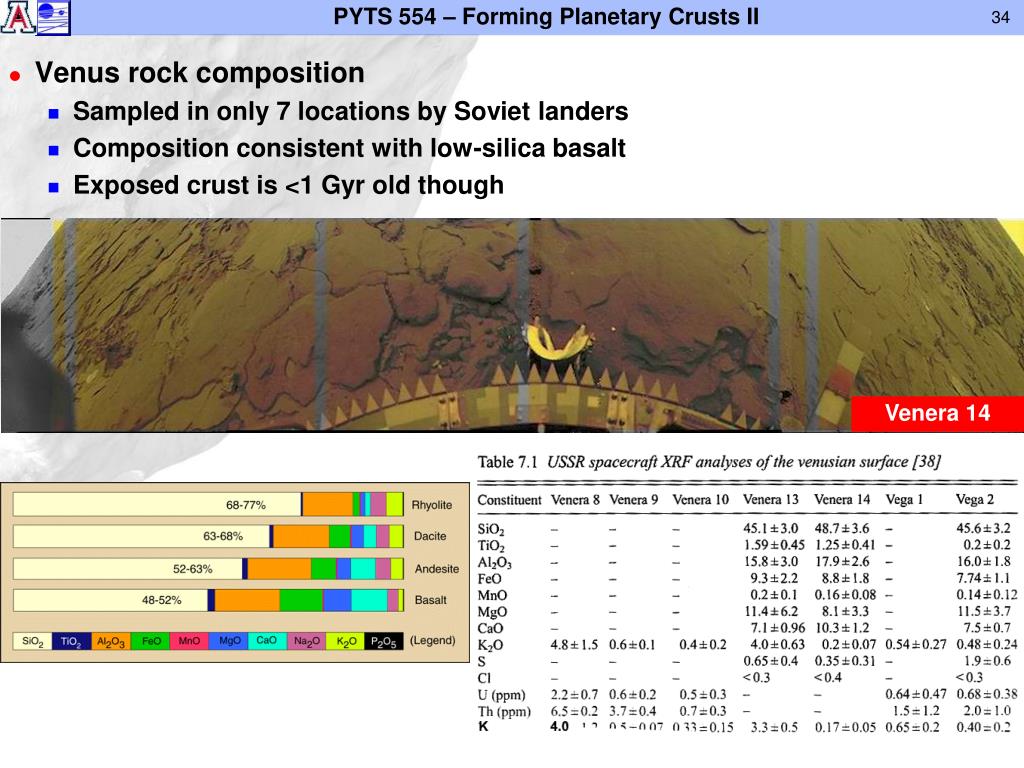 Venus rock composition • Sampled in only 7 locations by Soviet landers • Composition consistent with low-silica basalt • Exposed crust is <1 Gyr old though Venera 14