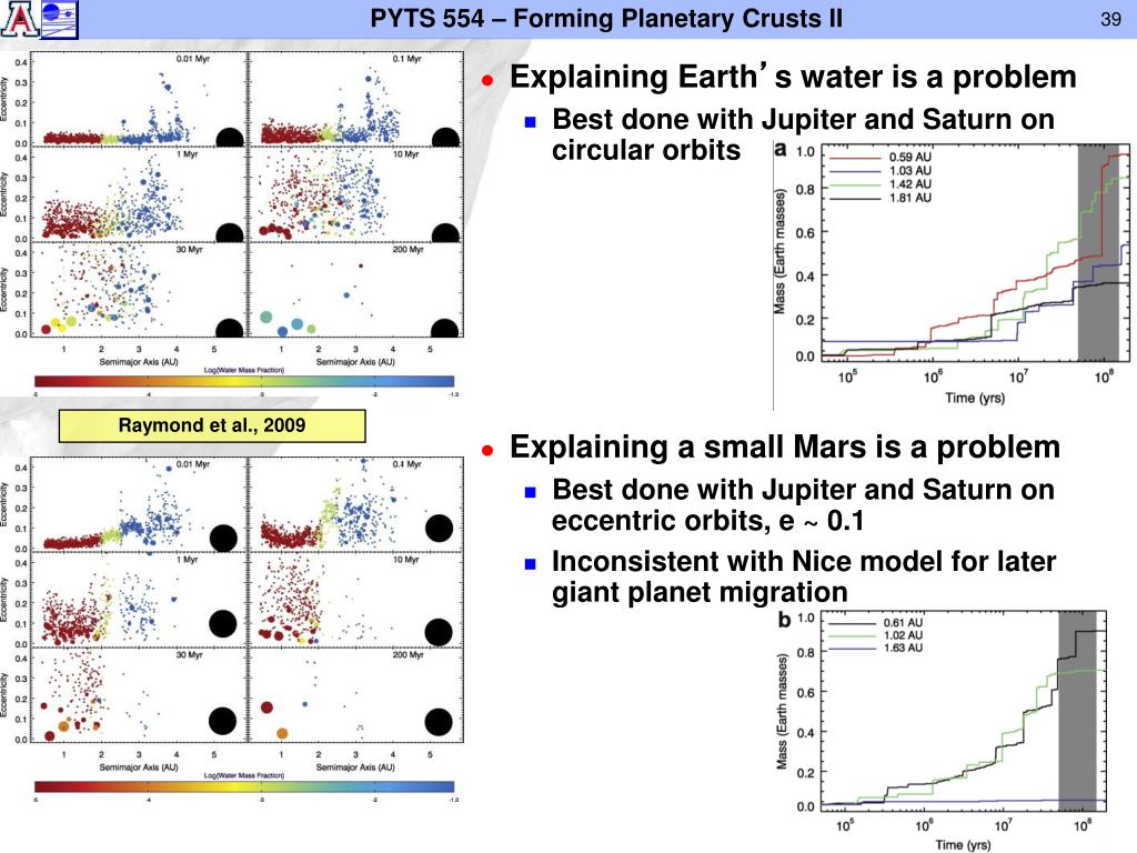 Explaining Earth’s water is a problem • Best done with Jupiter and Saturn on circular orbits • Explaining a small Mars is a problem • Best done with Jupiter and Saturn on eccentric orbits, e ~ 0.1 • Inconsistent with Nice model for later giant planet migration Raymond et al., 2009