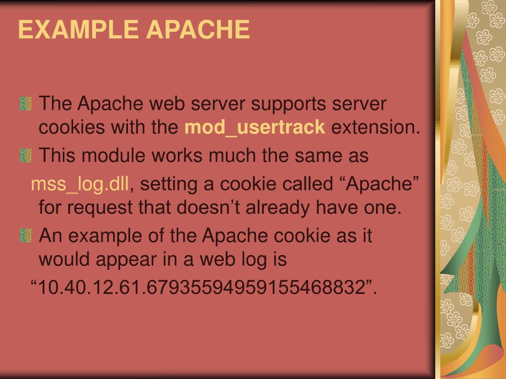 EXAMPLE APACHE • The Apache web server supports server cookies with the mod_usertrackextension. • This module works much the same as mss_log.dll, setting a cookie called “Apache” for request that doesn’t already have one. • An example of the Apache cookie as it would appear in a web log is “10.40.12.61.67935594959155468832”.