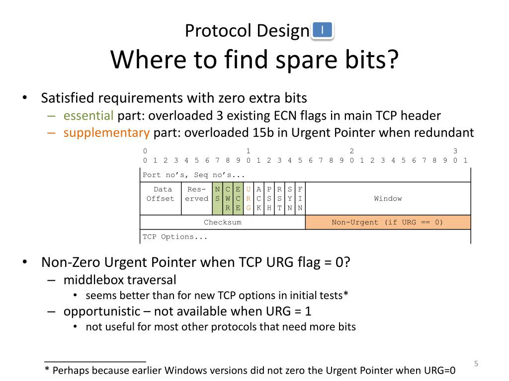 Protocol Design IWhere to find spare bits? I • Satisfied requirements with zero extra bits • essentialpart: overloaded 3 existing ECN flags in main TCP header • supplementary part: overloaded 15b in Urgent Pointer when redundant • Non-Zero Urgent Pointer when TCP URG flag = 0? • middlebox traversal • seems better than for new TCP options in initial tests* • opportunistic – not available when URG = 1 • not useful for most other protocols that need more bits • * Perhaps because earlier Windows versions did not zero the Urgent Pointer when URG=0