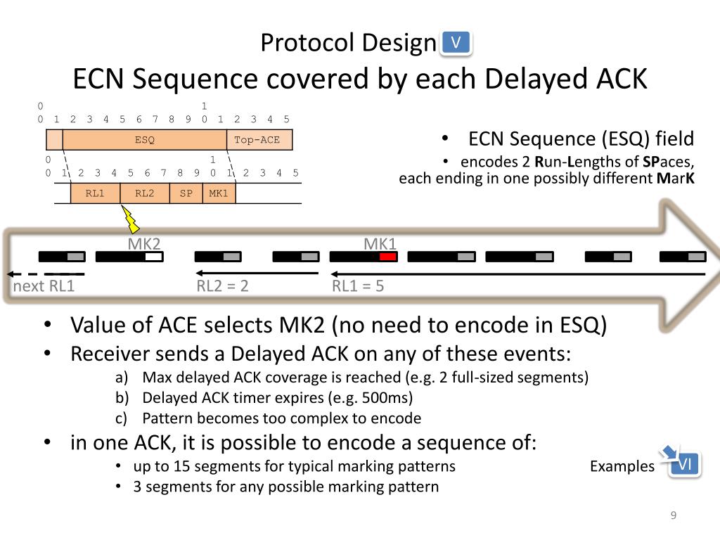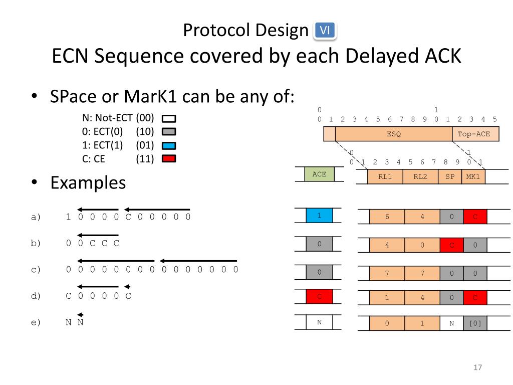 Protocol Design VECN Sequence covered by each Delayed ACK V • ECN Sequence (ESQ) field • encodes 2 Run-Lengths of SPaces,each ending in one possibly different MarK • Value of ACE selects MK2 (no need to encode in ESQ) • Receiver sends a Delayed ACK on any of these events: • Max delayed ACK coverage is reached (e.g. 2 full-sized segments) • Delayed ACK timer expires (e.g. 500ms) • Pattern becomes too complex to encode • in one ACK, it is possible to encode a sequence of: • up to 15 segments for typical marking patterns Examples • 3 segments for any possible marking pattern VI MK2 MK1 next RL1 RL2 = 2 RL1 = 5