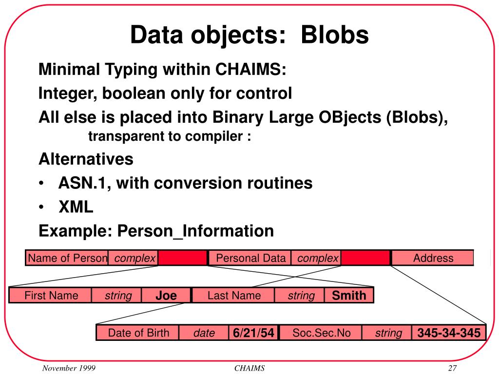 Data objects: Blobs Minimal Typing within CHAIMS: Integer, boolean only for control All else is placed into Binary Large OBjects (Blobs), transparent to compiler : Alternatives • ASN.1, with conversion routines • XML Example: Person_Information Name of Person complex Personal Data complex Address First Name string Joe Last Name string Smith Date of Birth date 6/21/54 Soc.Sec.No string 345-34-345 CHAIMS