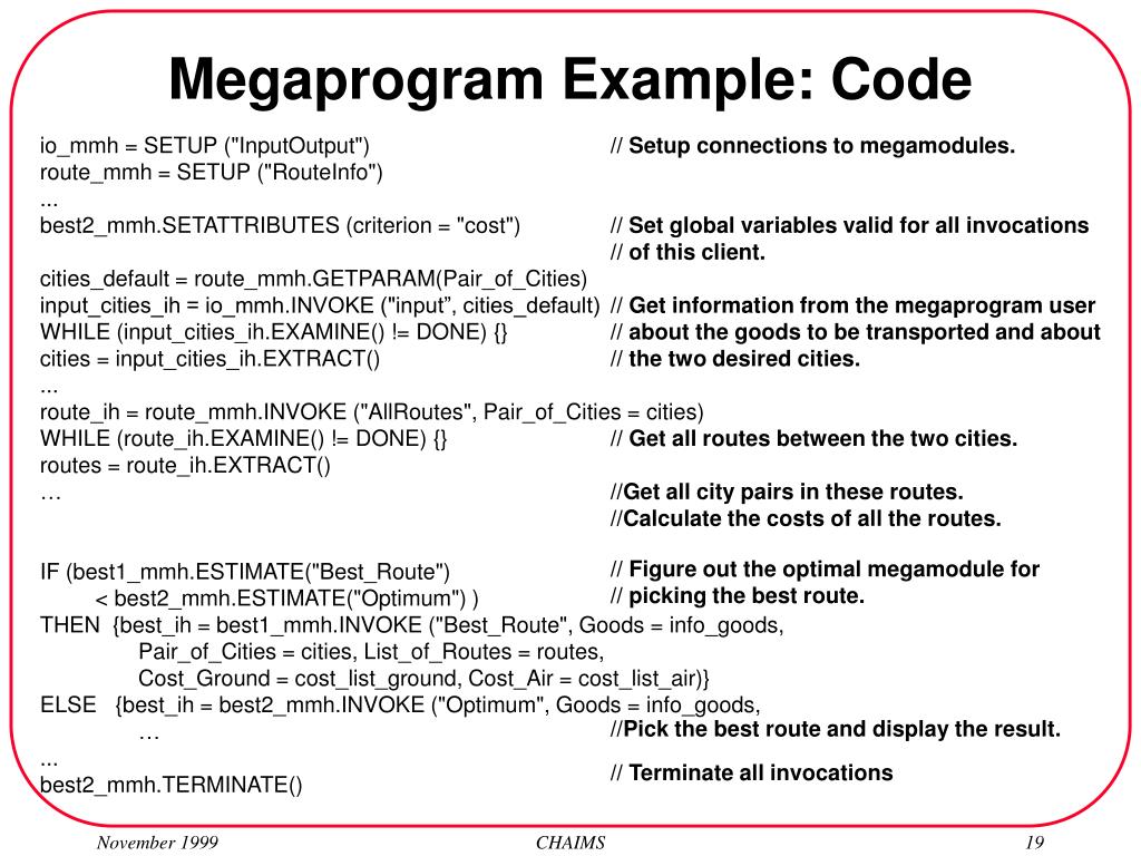 Megaprogram Example: Code io_mmh = SETUP ("InputOutput") route_mmh = SETUP ("RouteInfo") ... best2_mmh.SETATTRIBUTES (criterion = "cost") cities_default = route_mmh.GETPARAM(Pair_of_Cities) input_cities_ih = io_mmh.INVOKE ("input”, cities_default) WHILE (input_cities_ih.EXAMINE() != DONE) {} cities = input_cities_ih.EXTRACT() ... route_ih = route_mmh.INVOKE ("AllRoutes", Pair_of_Cities = cities) WHILE (route_ih.EXAMINE() != DONE) {} routes = route_ih.EXTRACT() … IF (best1_mmh.ESTIMATE("Best_Route") < best2_mmh.ESTIMATE("Optimum") ) THEN {best_ih = best1_mmh.INVOKE ("Best_Route", Goods = info_goods, Pair_of_Cities = cities, List_of_Routes = routes, Cost_Ground = cost_list_ground, Cost_Air = cost_list_air)} ELSE {best_ih = best2_mmh.INVOKE ("Optimum", Goods = info_goods, … ... best2_mmh.TERMINATE() // Setup connections to megamodules. // Set global variables valid for all invocations // of this client. // Get information from the megaprogram user // about the goods to be transported and about // the two desired cities. // Get all routes between the two cities. //Get all city pairs in these routes. //Calculate the costs of all the routes. // Figure out the optimal megamodule for // picking the best route. //Pick the best route and display the result. // Terminate all invocations CHAIMS