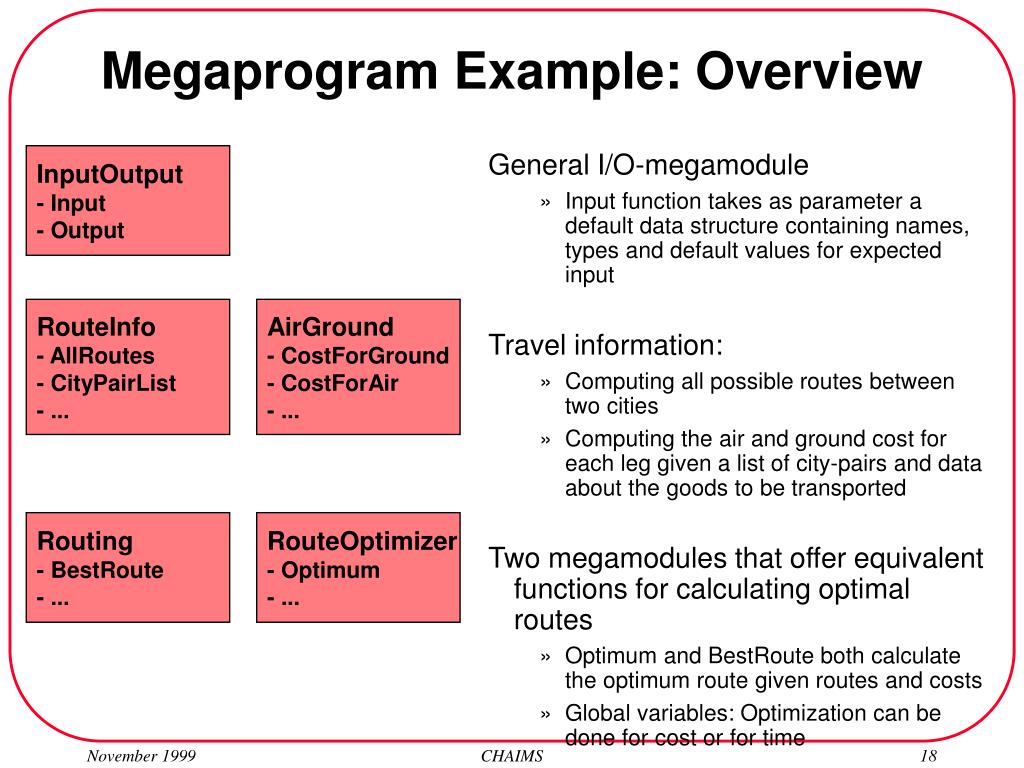 Megaprogram Example: Overview General I/O-megamodule • Input function takes as parameter a default data structure containing names, types and default values for expected input Travel information: • Computing all possible routes between two cities • Computing the air and ground cost for each leg given a list of city-pairs and data about the goods to be transported Two megamodules that offer equivalent functions for calculating optimal routes • Optimum and BestRoute both calculate the optimum route given routes and costs • Global variables: Optimization can be done for cost or for time InputOutput - Input - Output RouteInfo - AllRoutes - CityPairList - ... AirGround - CostForGround - CostForAir - ... Routing - BestRoute - ... RouteOptimizer - Optimum - ... CHAIMS