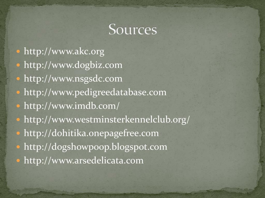 Sources • http://www.akc.org • http://www.dogbiz.com • http://www.nsgsdc.com • http://www.pedigreedatabase.com • http://www.imdb.com/ • http://www.westminsterkennelclub.org/ • http://dohitika.onepagefree.com • http://dogshowpoop.blogspot.com • http://www.arsedelicata.com