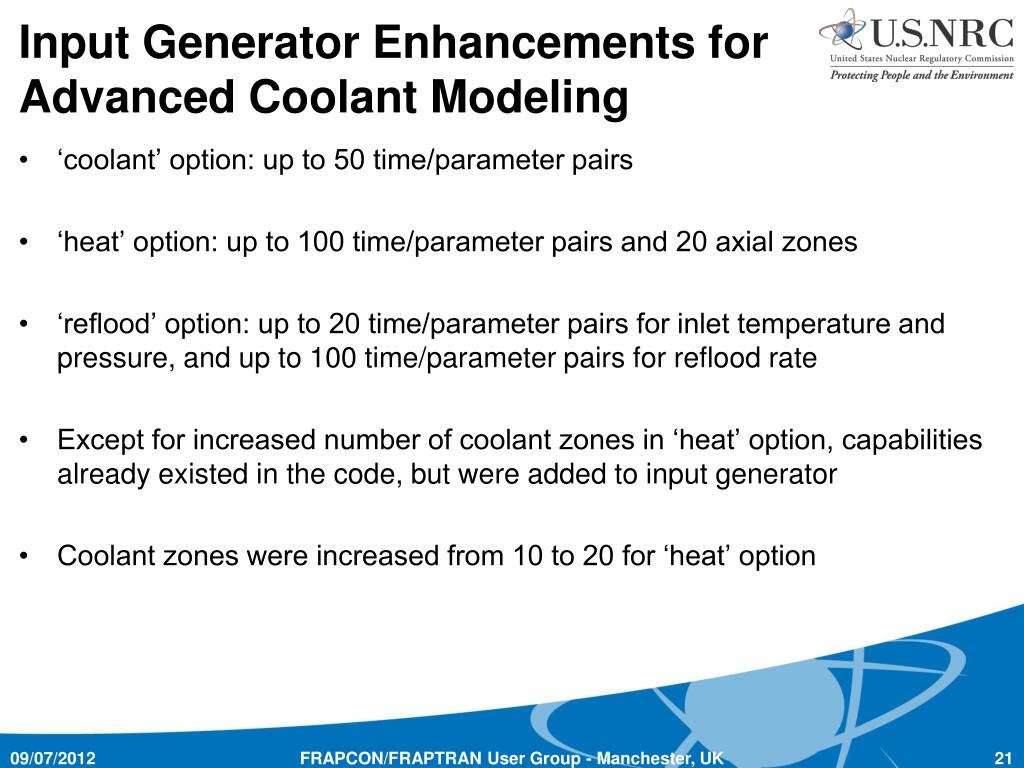 Input Generator Enhancements for Advanced Coolant Modeling • ‘coolant’ option: up to 50 time/parameter pairs • ‘heat’ option: up to 100 time/parameter pairs and 20 axial zones • ‘reflood’ option: up to 20 time/parameter pairs for inlet temperature and pressure, and up to 100 time/parameter pairs for reflood rate • Except for increased number of coolant zones in ‘heat’ option, capabilities already existed in the code, but were added to input generator • Coolant zones were increased from 10 to 20 for ‘heat’ option FRAPCON/FRAPTRAN User Group - Manchester, UK