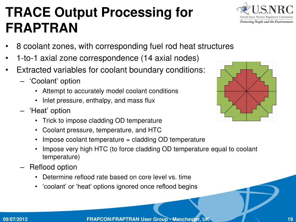 TRACE Output Processing for FRAPTRAN • 8 coolant zones, with corresponding fuel rod heat structures • 1-to-1 axial zone correspondence (14 axial nodes) • Extracted variables for coolant boundary conditions: • ‘Coolant’ option • Attempt to accurately model coolant conditions • Inlet pressure, enthalpy, and mass flux • ‘Heat’ option • Trick to impose cladding OD temperature • Coolant pressure, temperature, and HTC • Impose coolant temperature = cladding OD temperature • Impose very high HTC (to force cladding OD temperature equal to coolant temperature) • Reflood option • Determine reflood rate based on core level vs. time • ‘coolant’ or ‘heat’ options ignored once reflood begins FRAPCON/FRAPTRAN User Group - Manchester, UK