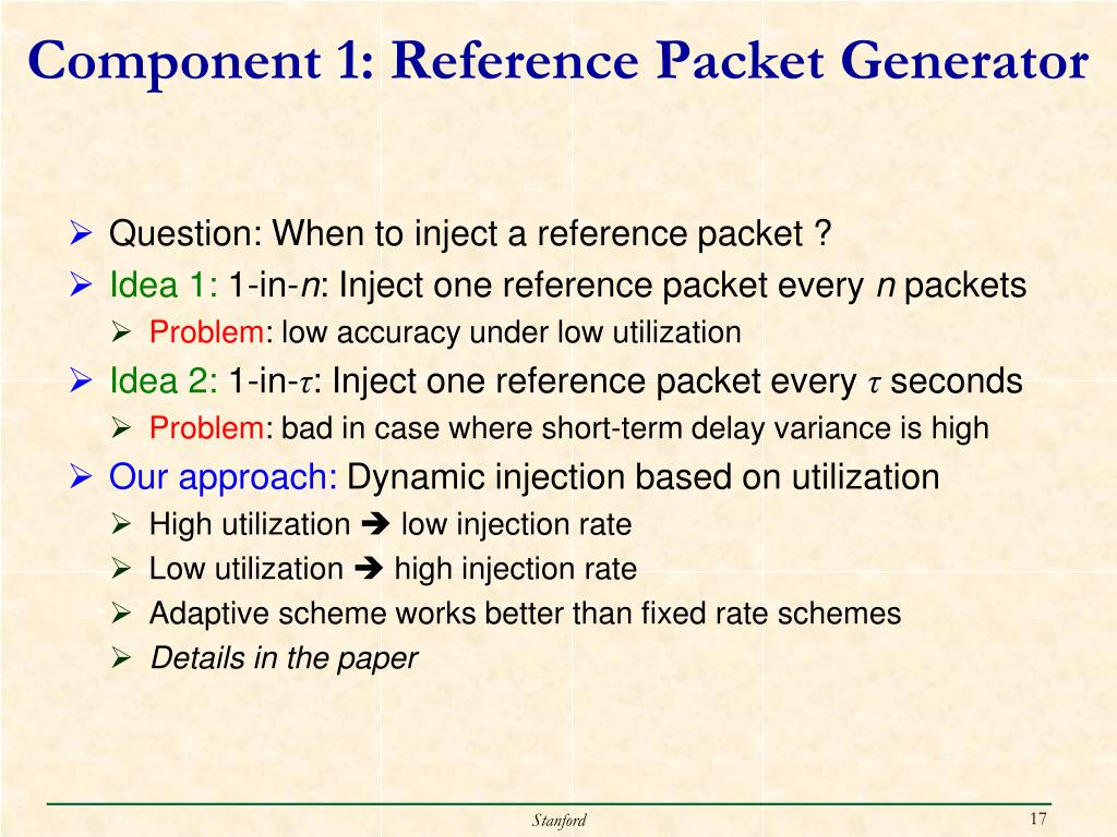 Component 1: Reference Packet Generator • Question: When to inject a reference packet ? • Idea 1: 1-in-n: Inject one reference packet every npackets • Problem: low accuracy under low utilization • Idea 2: 1-in-τ: Inject one reference packet every τseconds • Problem: bad in case where short-term delay variance is high • Our approach: Dynamic injection based on utilization • High utilization low injection rate • Low utilization high injection rate • Adaptive scheme works better than fixed rate schemes • Details in the paper Stanford