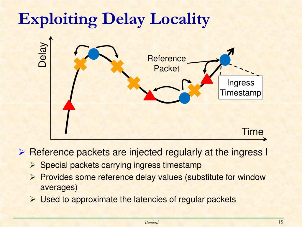 Exploiting Delay Locality Delay Ingress Timestamp Reference Packet Time • Reference packets are injected regularly at the ingress I • Special packets carrying ingress timestamp • Provides some reference delay values (substitute for window averages) • Used to approximate the latencies of regular packets Stanford