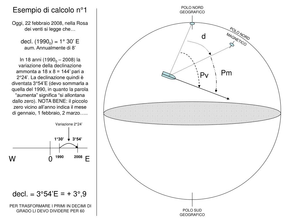 Esempio di calcolo n°1 Oggi, 22 febbraio 2008, nella Rosa dei venti si legge che… decl. (19900) = 1° 30’ E aum. Annualmente di 8’ In 18 anni (19900 – 2008) la variazione della declinazione ammonta a 18 x 8 = 144’ pari a 2°24’. La declinazione quindi è diventata 3°54’E (devo sommarla a quella del 1990, in quanto la parola “aumenta” significa “si allontana dallo zero). NOTA BENE: il piccolo zero vicino all’anno indica il mese di gennaio, 1 febbraio, 2 marzo….. POLO NORD GEOGRAFICO POLO NORD MAGNETICO d Pm Pv Variazione 2°24’ 1°30’ 3°54’ W 0 E 1990 2008 decl. = 3°54’E = + 3°,9 PER TRASFORMARE I PRIMI IN DECIMI DI GRADO LI DEVO DIVIDERE PER 60 POLO SUD GEOGRAFICO