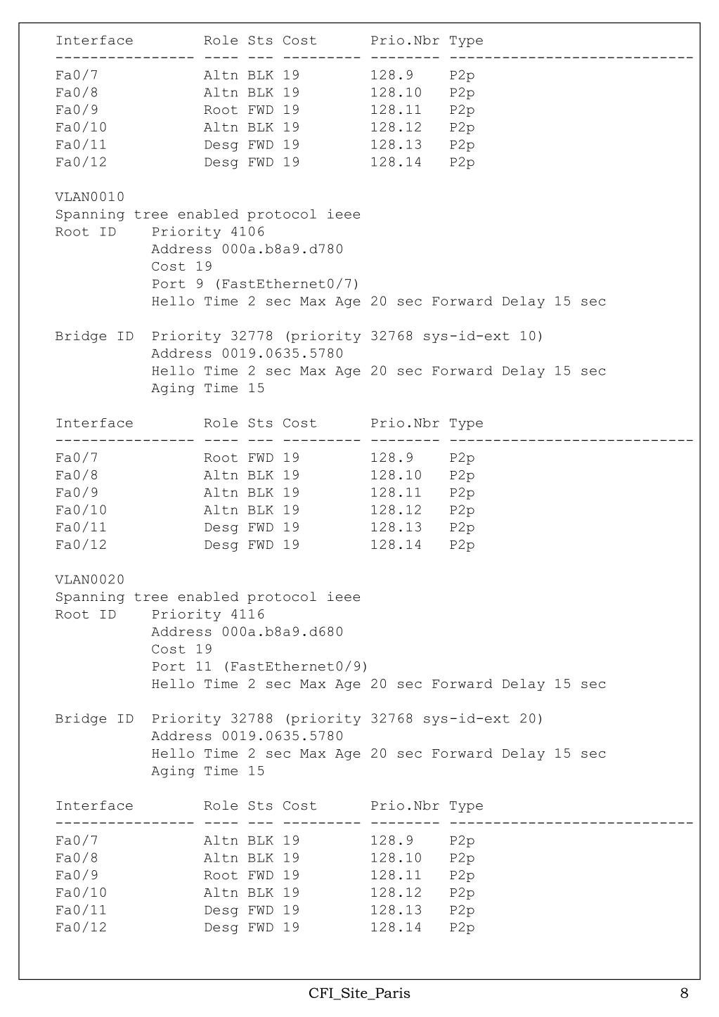 Interface Role Sts Cost Prio.Nbr Type ---------------- ---- --- --------- -------- ---------------------------- Fa0/7 Altn BLK 19 128.9 P2p Fa0/8 Altn BLK 19 128.10 P2p Fa0/9 Root FWD 19 128.11 P2p Fa0/10 Altn BLK 19 128.12 P2p Fa0/11 Desg FWD 19 128.13 P2p Fa0/12 Desg FWD 19 128.14 P2p VLAN0010 Spanning tree enabled protocol ieee Root ID Priority 4106 Address 000a.b8a9.d780 Cost 19 Port 9 (FastEthernet0/7) Hello Time 2 sec Max Age 20 sec Forward Delay 15 sec Bridge ID Priority 32778 (priority 32768 sys-id-ext 10) Address 0019.0635.5780 Hello Time 2 sec Max Age 20 sec Forward Delay 15 sec Aging Time 15 Interface Role Sts Cost Prio.Nbr Type ---------------- ---- --- --------- -------- ---------------------------- Fa0/7 Root FWD 19 128.9 P2p Fa0/8 Altn BLK 19 128.10 P2p Fa0/9 Altn BLK 19 128.11 P2p Fa0/10 Altn BLK 19 128.12 P2p Fa0/11 Desg FWD 19 128.13 P2p Fa0/12 Desg FWD 19 128.14 P2p VLAN0020 Spanning tree enabled protocol ieee Root ID Priority 4116 Address 000a.b8a9.d680 Cost 19 Port 11 (FastEthernet0/9) Hello Time 2 sec Max Age 20 sec Forward Delay 15 sec Bridge ID Priority 32788 (priority 32768 sys-id-ext 20) Address 0019.0635.5780 Hello Time 2 sec Max Age 20 sec Forward Delay 15 sec Aging Time 15 Interface Role Sts Cost Prio.Nbr Type ---------------- ---- --- --------- -------- ---------------------------- Fa0/7 Altn BLK 19 128.9 P2p Fa0/8 Altn BLK 19 128.10 P2p Fa0/9 Root FWD 19 128.11 P2p Fa0/10 Altn BLK 19 128.12 P2p Fa0/11 Desg FWD 19 128.13 P2p Fa0/12 Desg FWD 19 128.14 P2p CFI_Site_Paris