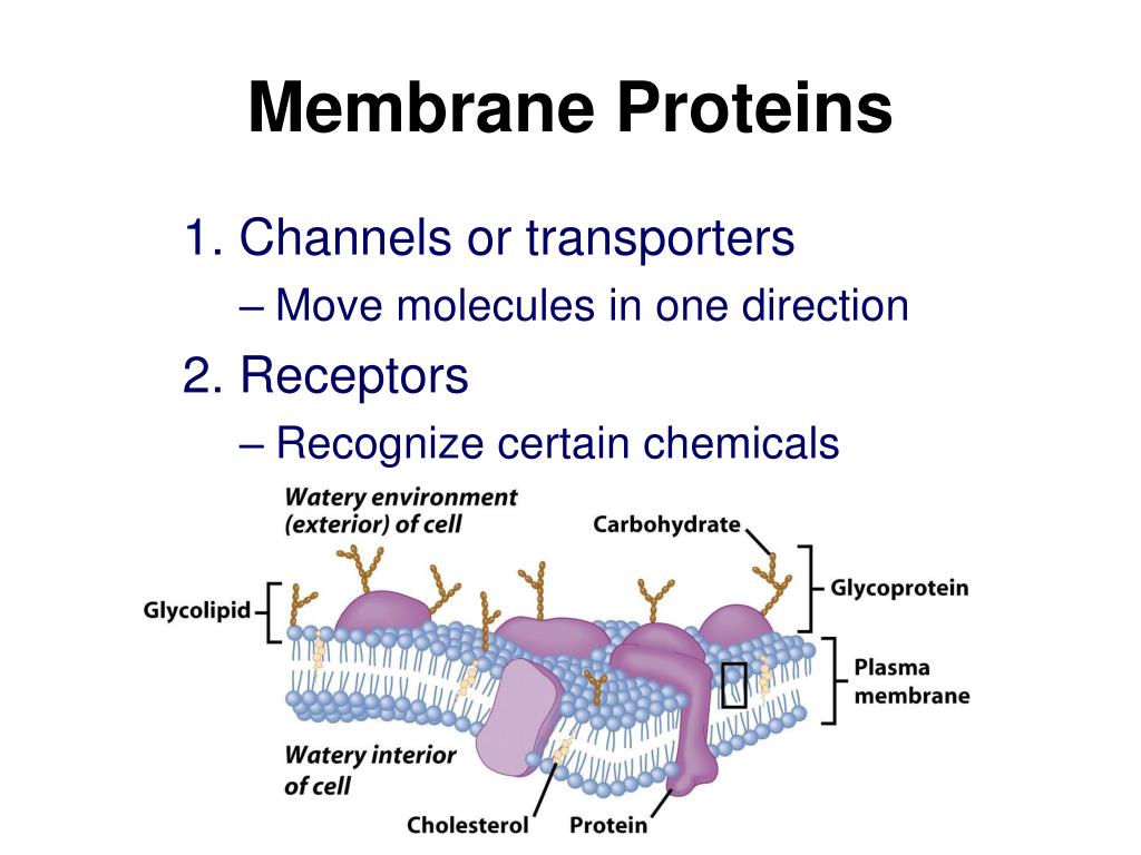 Membrane Proteins • 1. Channels or transporters • Move molecules in one direction 2. Receptors • Recognize certain chemicals