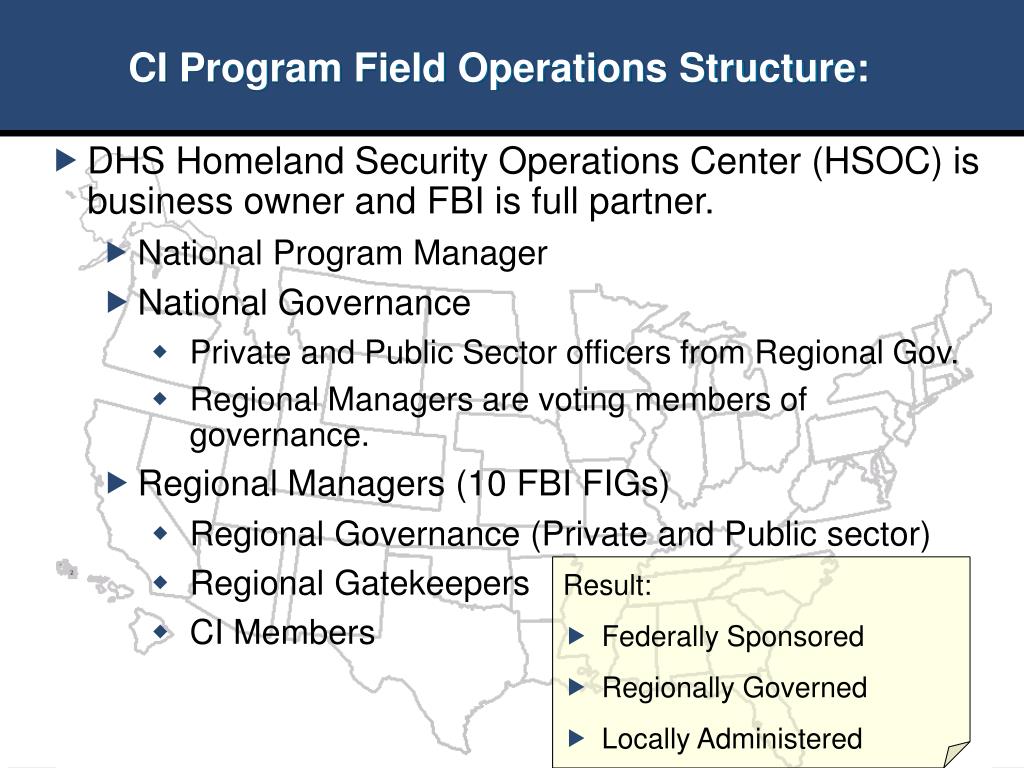 DHS Homeland Security Operations Center (HSOC) is business owner and FBI is full partner. National Program Manager National Governance Private and Public Sector officers from Regional Gov. Regional Managers are voting members of governance. Regional Managers (10 FBI FIGs) Regional Governance (Private and Public sector) Regional Gatekeepers CI Members CI Program Field Operations Structure: • Result: • Federally Sponsored • Regionally Governed • Locally Administered