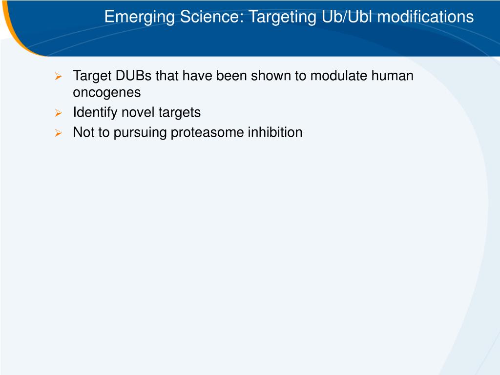 Emerging Science: Targeting Ub/Ubl modifications • Target DUBs that have been shown to modulate human oncogenes • Identify novel targets • Not to pursuing proteasome inhibition