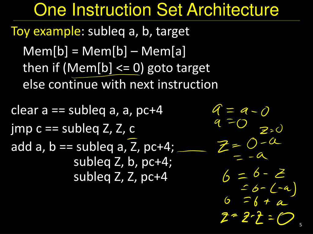 One Instruction Set Architecture • Toy example: subleq a, b, target • Mem[b] = Mem[b] – Mem[a]then if (Mem[b] <= 0) goto targetelse continue with next instruction clear a == subleq a, a, pc+4 jmp c == subleq Z, Z, c add a, b == subleq a, Z, pc+4; subleq Z, b, pc+4; subleq Z, Z, pc+4