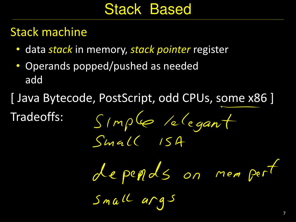 Stack Based • Stack machine • data stack in memory, stack pointerregister • Operands popped/pushed as neededadd • [ Java Bytecode, PostScript, odd CPUs, some x86 ] • Tradeoffs:
