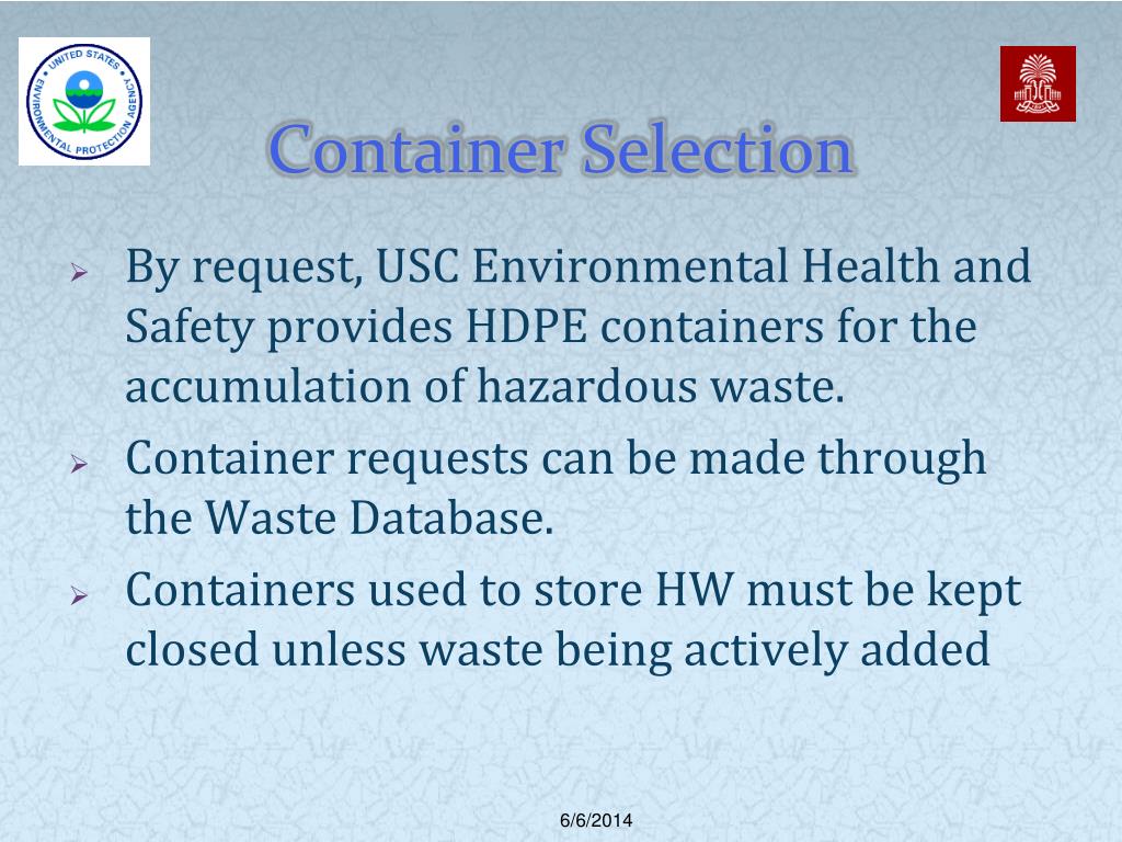 Container Selection • By request, USC Environmental Health and Safety provides HDPE containers for the accumulation of hazardous waste. • Container requests can be made through the Waste Database. • Containers used to store HW must be kept closed unless waste being actively added