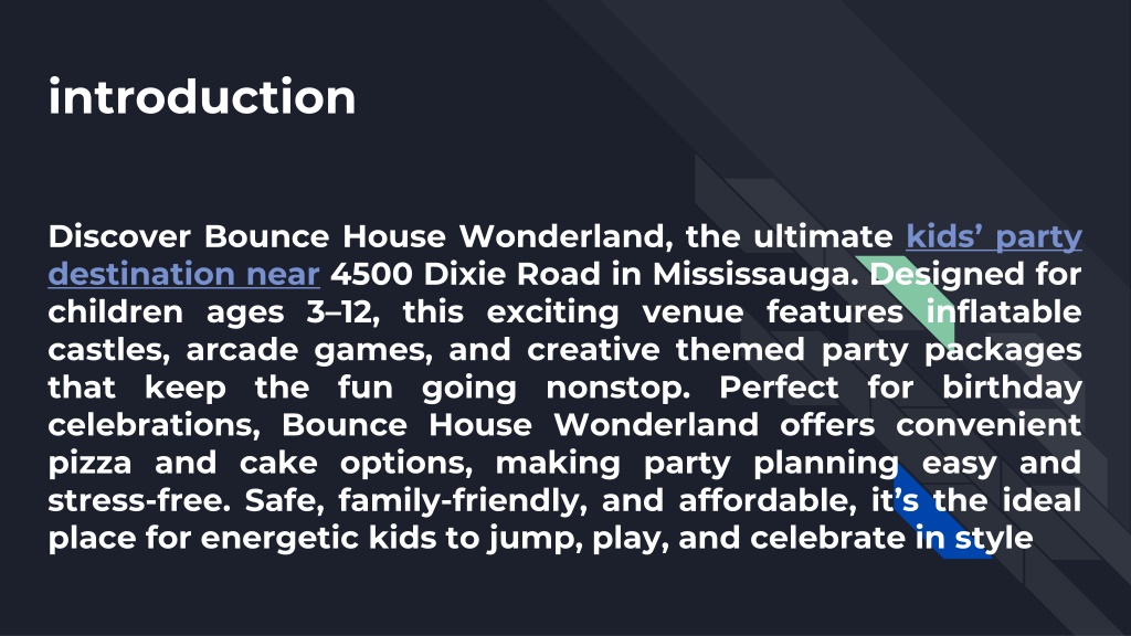 introduction Discover Bounce House Wonderland, the ultimate kids’ party destination near 4500 Dixie Road in Mississauga. Designed for children ages 3–12, this exciting venue features inflatable castles, arcade games, and creative themed party packages that keep the fun going nonstop. Perfect for birthday celebrations, Bounce House Wonderland offers convenient pizza and cake options, making party planning easy and stress-free. Safe, family-friendly, and affordable, it’s the ideal place for energetic kids to jump, play, and celebrate in style