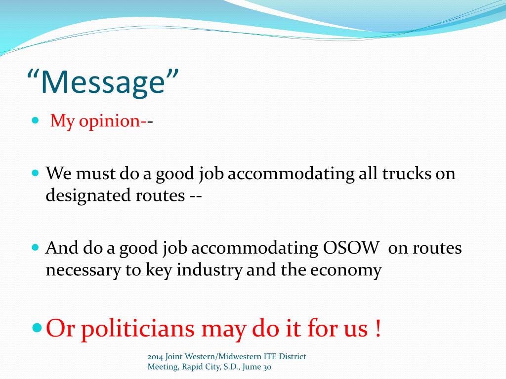 “Message” • My opinion-- • We must do a good job accommodating all trucks on designated routes -- • And do a good job accommodating OSOW on routes necessary to key industry and the economy • Or politicians may do it for us ! 2014 Joint Western/Midwestern ITE District Meeting, Rapid City, S.D., Jume 30