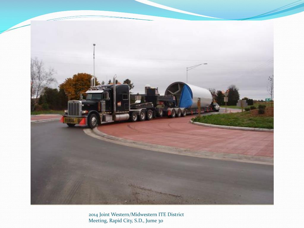 Study Objectives • Overall Paraphrased; accommodate the growing demand for OSOW without having a negative effect on roundabout growth on state highways. • Compile current practice and research by states and foreign countries related to effects that OSOW have on roundabout location, design and accommodation. [4Surveys] • Fill in information gaps with respect to roundabout design and operations for this class of vehicle[Interviews, emails ] 2014 Joint Western/Midwestern ITE District Meeting, Rapid City, S.D., Jume 30