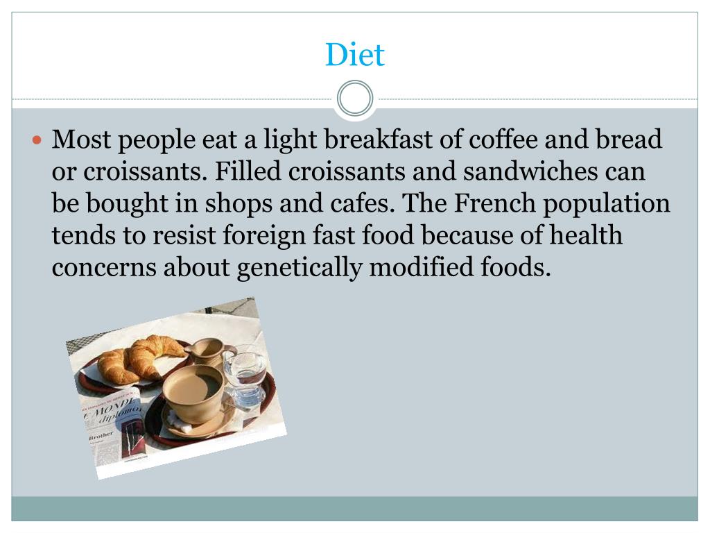 Diet • Most people eat a light breakfast of coffee and bread or croissants. Filled croissants and sandwiches can be bought in shops and cafes. The French population tends to resist foreign fast food because of health concerns about genetically modified foods.