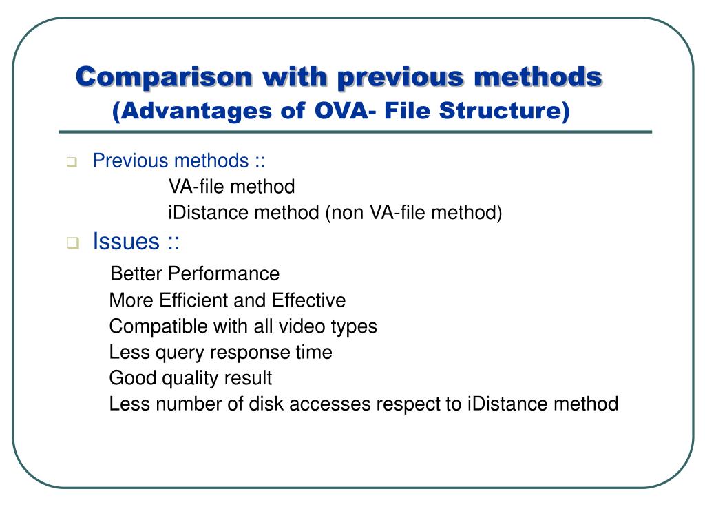 Comparison with previous methods(Advantages of OVA- File Structure) • Previous methods :: VA-file method iDistance method (non VA-file method) • Issues :: Better Performance More Efficient and Effective Compatible with all video types Less query response time Good quality result Less number of disk accesses respect to iDistance method