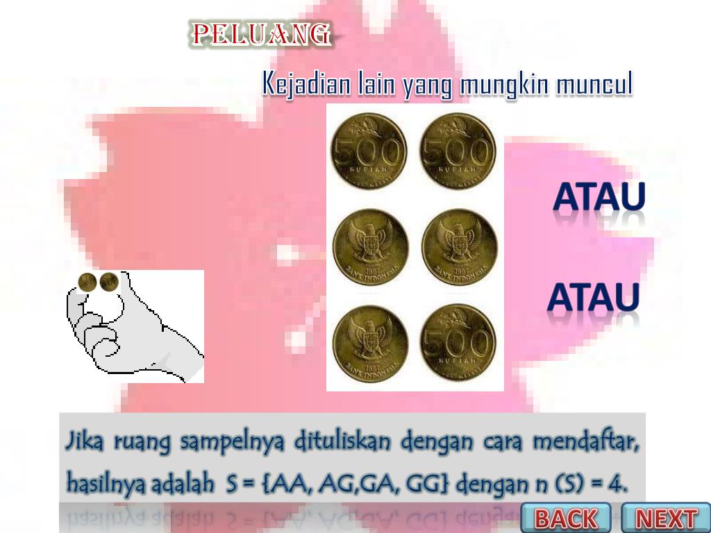 PELUANG Kejadian lain yang mungkin muncul atau atau Jikaruangsampelnyadituliskandengancaramendaftar, hasilnyaadalah S = {AA, AG,GA, GG} dengan n (S) = 4. BACK NEXT