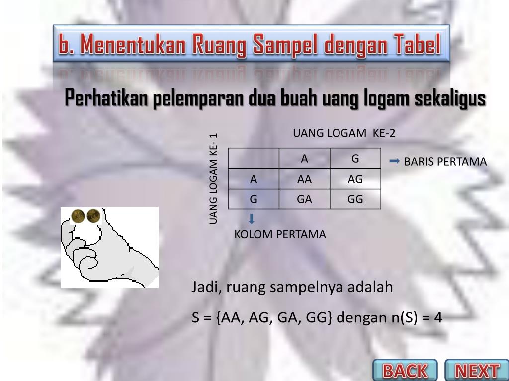 b. MenentukanRuangSampeldenganTabel Perhatikan pelemparanduabuahuanglogamsekaligus UANG LOGAM KE-2 BARIS PERTAMA UANG LOGAM KE- 1 KOLOM PERTAMA Jadi, ruangsampelnyaadalah S = {AA, AG, GA, GG} dengan n(S) = 4 BACK NEXT