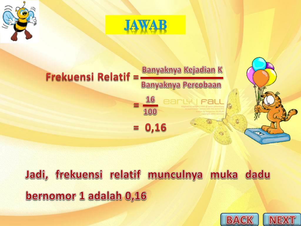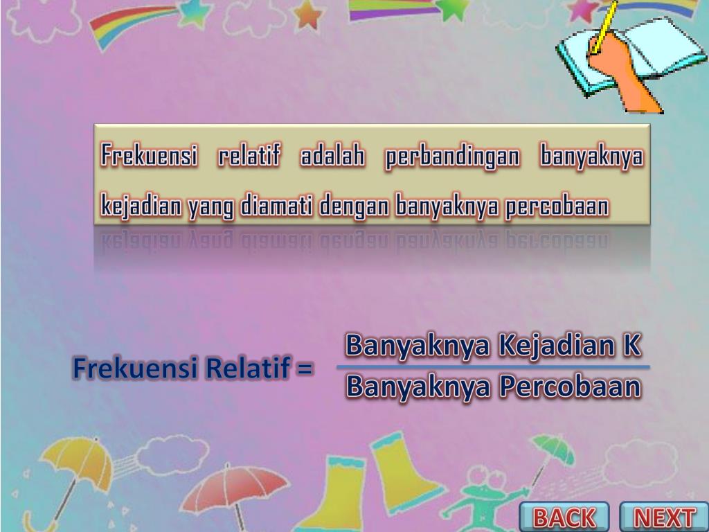 Frekuensi relatif adalah perbandingan banyaknya kejadian yang diamati dengan banyaknya percobaan BanyaknyaKejadian K FrekuensiRelatif = BanyaknyaPercobaan BACK NEXT
