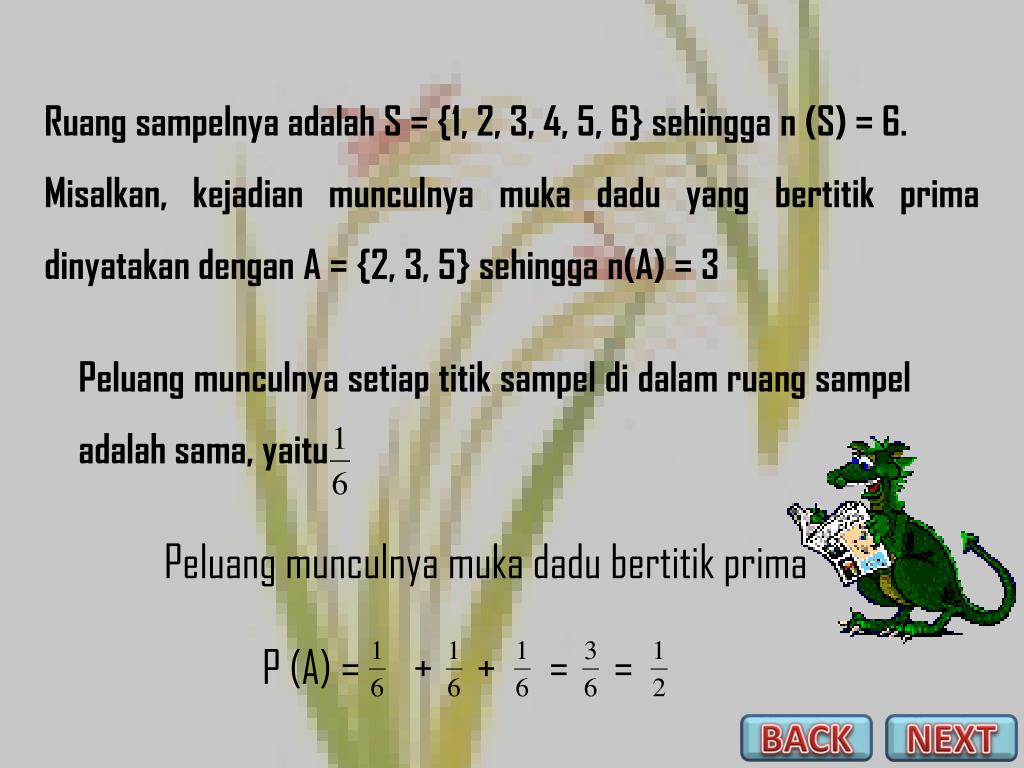 Ruangsampelnyaadalah S = {1, 2, 3, 4, 5, 6} sehingga n (S) = 6. Misalkan, kejadianmunculnyamukadadu yang bertitik prima dinyatakandengan A = {2, 3, 5} sehingga n(A) = 3 Peluangmunculnyasetiaptitiksampeldidalamruangsampeladalahsama, yaitu Peluangmunculnyamukadadubertitik prima P (A) = + + = = BACK NEXT