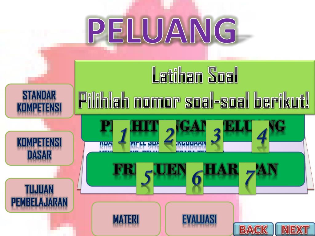PELUANG Latihan Soal Pilihlah nomor soal-soal berikut! Dasar-DasarPeluang STANDARKOMPETENSI PerhitunganPeluang 1 2 3 4 KOMPETENSIDASAR FrekuensiHarapan 5 6 7 TUJUAN PEMBELAJARAN MATERI EVALUASI BACK NEXT