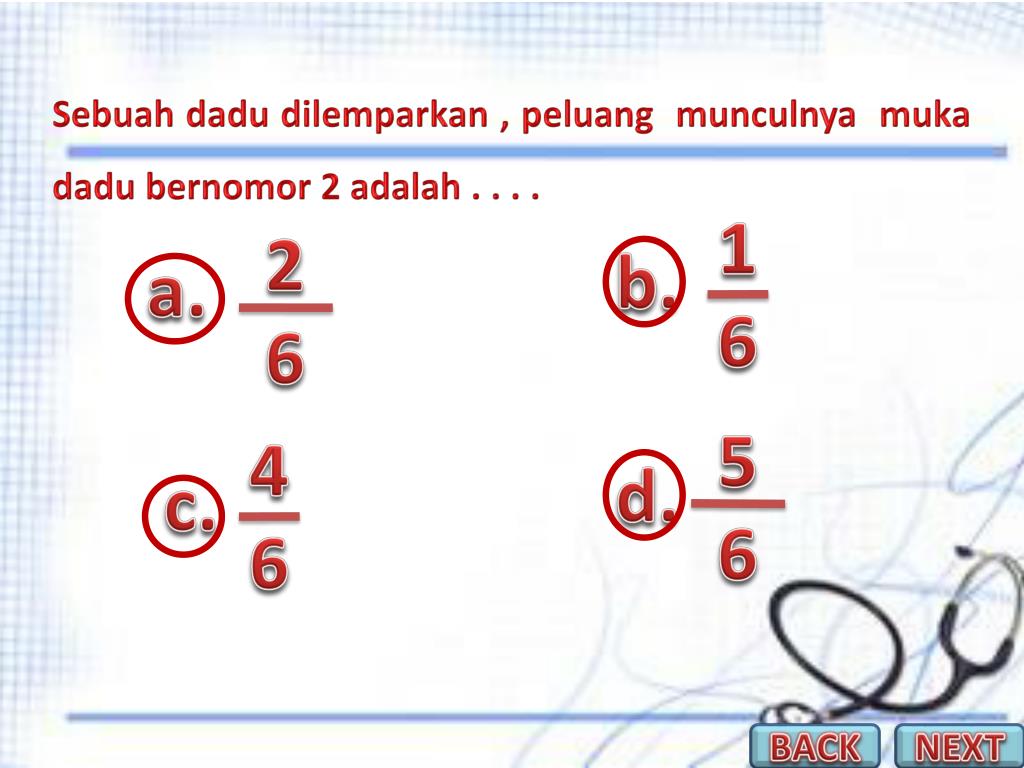 Sebuah dadu dilemparkan , peluang munculnya muka dadu bernomor 2 adalah . . . . 1 6 b. a. 5 6 2 6 d. 4 6 c. BACK NEXT