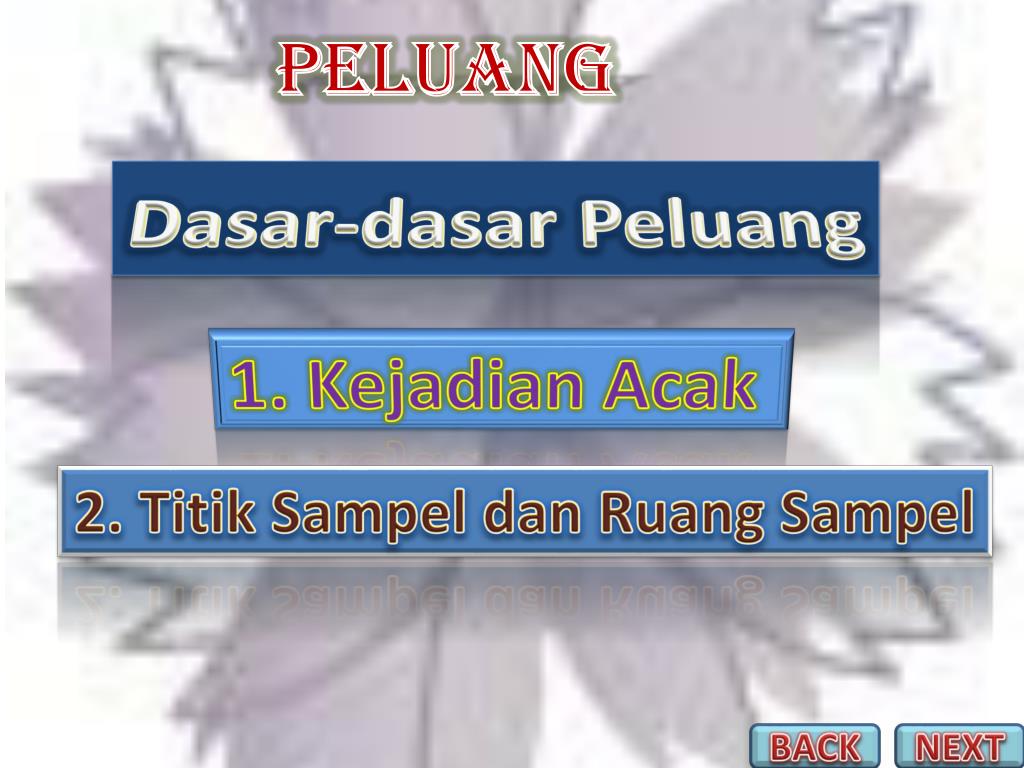 PELUANG Dasar-dasarPeluang 1. KejadianAcak 2. TitikSampeldanRuangSampel BACK NEXT