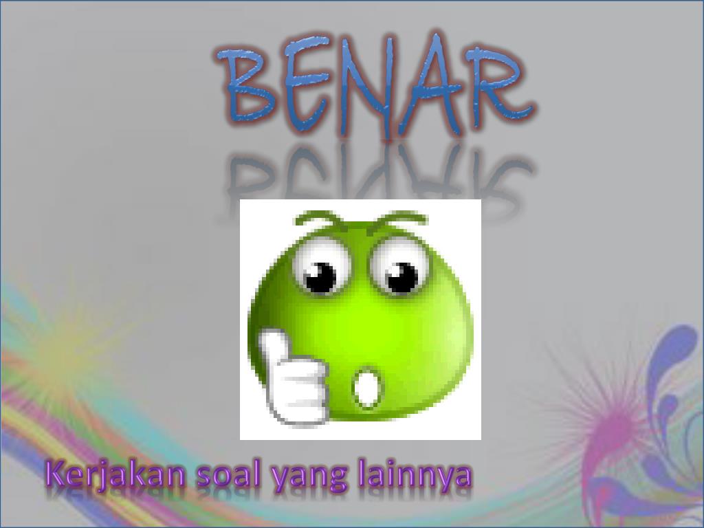 Jawab • Ruangsampelpercobaan = {1, 2, 3, 4, 5, 6} • Kejadianmunculmatadadu 4 = {4} • Kejadianmunculmatadaduganjil = {1,3,5} • Kejadianmunculmatadadugenap = {2,4,6} • Kejadianmunculmatadadulebihdariatausamadengan3 = {3,4,5,6} BACK NEXT