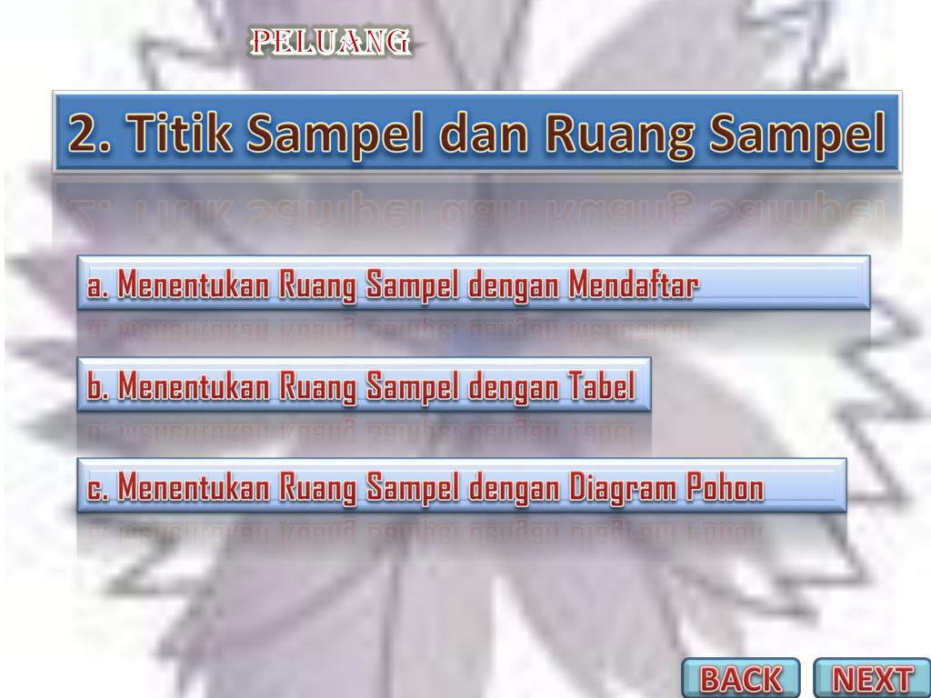 PELUANG 2. TitikSampeldanRuangSampel • a. MenentukanRuangSampeldenganMendaftar b. MenentukanRuangSampeldenganTabel c. MenentukanRuangSampeldengan Diagram Pohon BACK NEXT