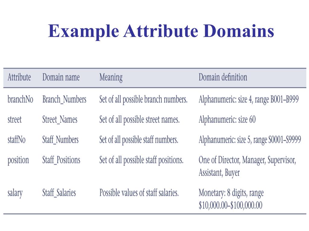 Domain Constraints • The value of each attribute, A, must be an atomic value from the domain of A • So, if an attribute is from the domain of a phone number, then the attribute must be a phone number.