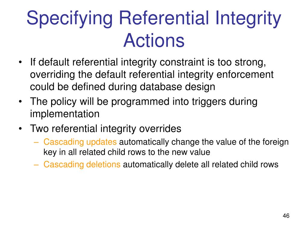 Specifying Referential Integrity Actions • If default referential integrity constraint is too strong, overriding the default referential integrity enforcement could be defined during database design • The policy will be programmed into triggers during implementation • Two referential integrity overrides • Cascading updates automatically change the value of the foreign key in all related child rows to the new value • Cascading deletions automatically delete all related child rows