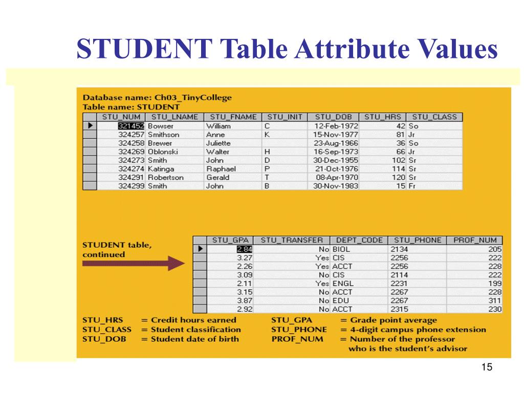 Relational Database Terminology • Attribute: • A named column of a relation. Each column represents an attribute. • Each column has a distinct name within a table. • Order of columns has no significance. • All values in a column must conform to the same data format. For example, if the attribute is assigned an integer data format, all values in the column representing that attribute must be integer. • Each column has a specific range of values known as the attribute domain.