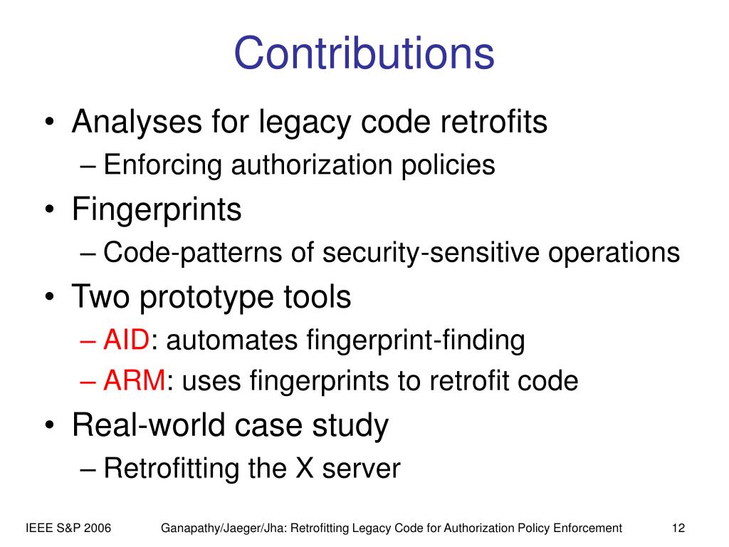 Talk outline • Motivation and contributions • Retrofitting legacy code: Lifecycle • Our techniques • Fingerprints • Finding fingerprints: AID • Using fingerprints: ARM • Conclusion Ganapathy/Jaeger/Jha: Retrofitting Legacy Code for Authorization Policy Enforcement