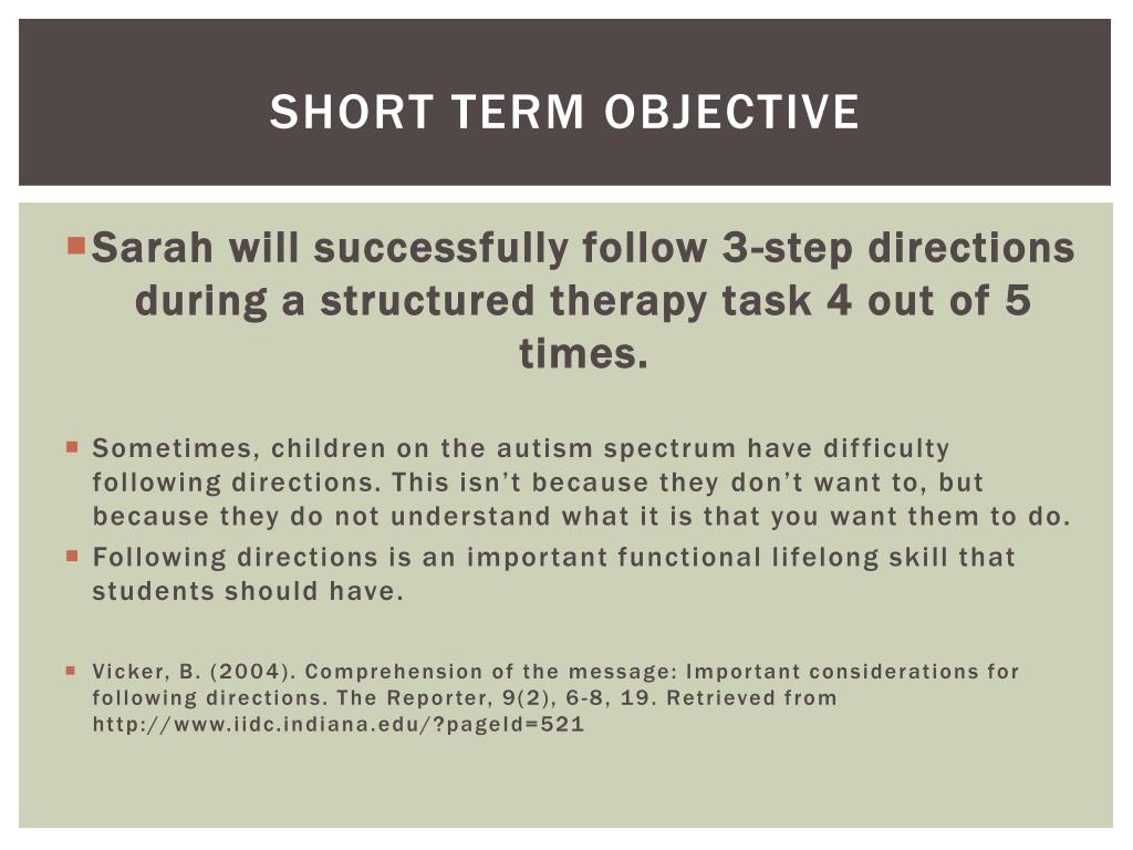Short term objective • Sarah will successfully follow 3-step directions during a structured therapy task 4 out of 5 times. • Sometimes, children on the autism spectrum have difficulty following directions. This isn’t because they don’t want to, but because they do not understand what it is that you want them to do. • Following directions is an important functional lifelong skill that students should have. • Vicker, B. (2004). Comprehension of the message: Important considerations for following directions. The Reporter, 9(2), 6-8, 19. Retrieved from http://www.iidc.indiana.edu/?pageId=521
