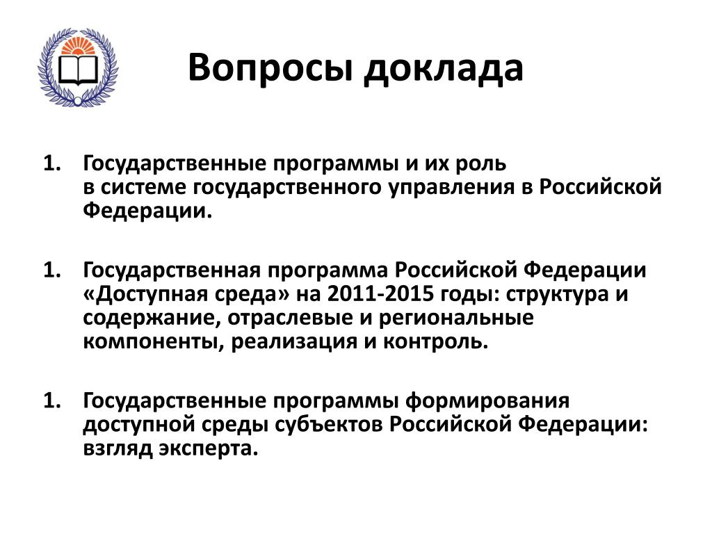 Вопросы доклада • Государственные программы и их роль в системе государственного управления в Российской Федерации. • Государственная программа Российской Федерации «Доступная среда» на 2011-2015 годы: структура и содержание, отраслевые и региональные компоненты, реализация и контроль. • Государственные программы формирования доступной среды субъектов Российской Федерации: взгляд эксперта.