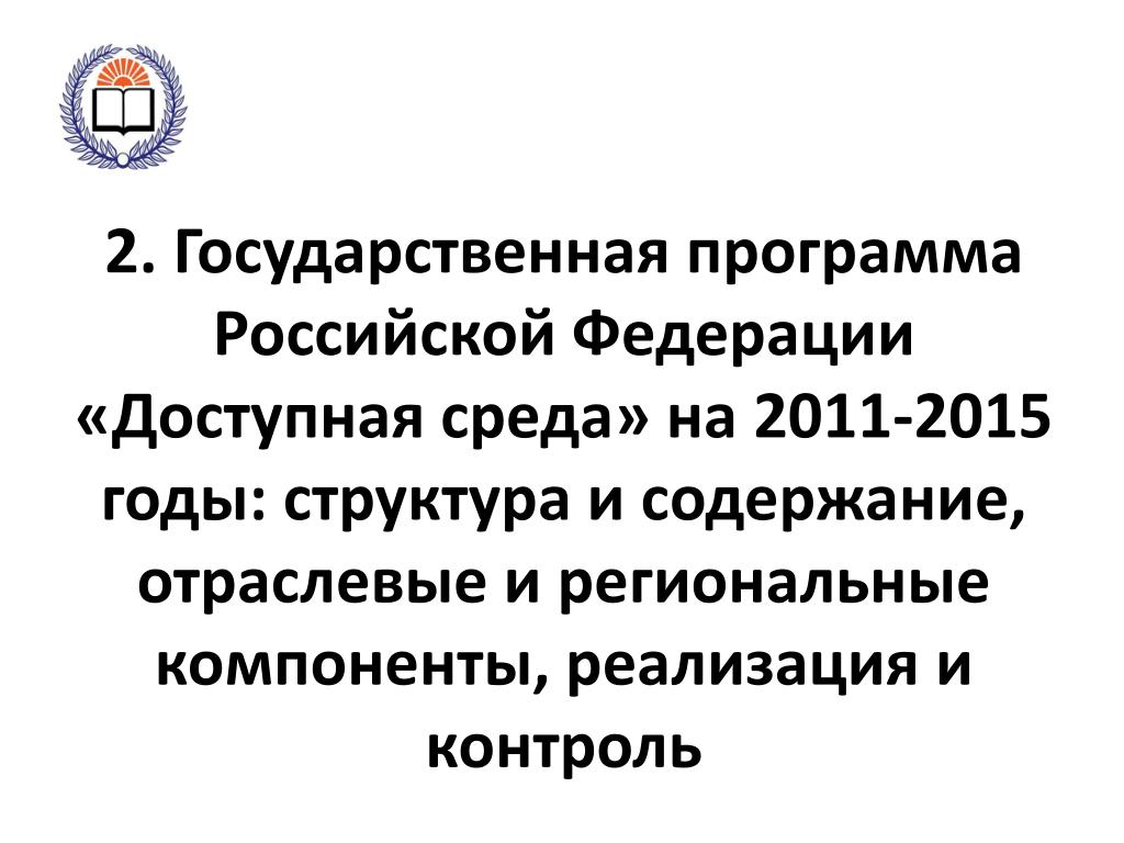 2. Государственная программа Российской Федерации «Доступная среда» на 2011-2015 годы: структура и содержание, отраслевые и региональные компоненты, реализация и контроль