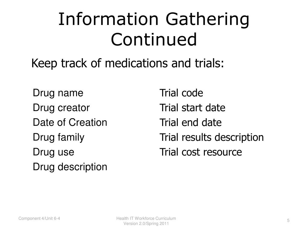 Information Gathering Continued Keep track of medications and trials: Drug name Drug creator Date of Creation Drug family Drug use Drug description Trial code Trial start date Trial end date Trial results description Trial cost resource Health IT Workforce Curriculum Version 2.0/Spring 2011
