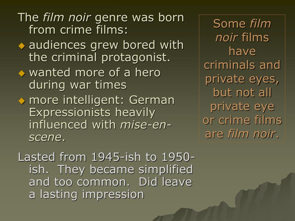The film noir genre was born from crime films: audiences grew bored with the criminal protagonist. wanted more of a hero during war times more intelligent: German Expressionists heavily influenced with mise-en-scene. Lasted from 1945-ish to 1950-ish. They became simplified and too common. Did leave a lasting impression Some film noir films have criminals and private eyes, but not all private eye or crime films are film noir.