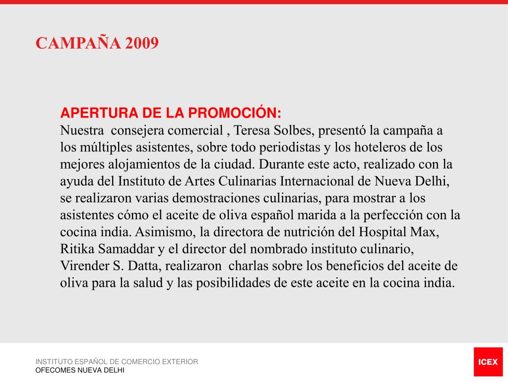 CAMPAÑA 2009 APERTURA DE LA PROMOCIÓN: Nuestra consejera comercial , Teresa Solbes, presentó la campaña a los múltiples asistentes, sobre todo periodistas y los hoteleros de los mejores alojamientos de la ciudad. Durante este acto, realizado con la ayuda del Instituto de Artes Culinarias Internacional de Nueva Delhi, se realizaron varias demostraciones culinarias, para mostrar a los asistentes cómo el aceite de oliva español marida a la perfección con la cocina india. Asimismo, la directora de nutrición del Hospital Max, Ritika Samaddar y el director del nombrado instituto culinario, Virender S. Datta, realizaron charlas sobre los beneficios del aceite de oliva para la salud y las posibilidades de este aceite en la cocina india. INSTITUTO ESPAÑOL DE COMERCIO EXTERIOR OFECOMES NUEVA DELHI