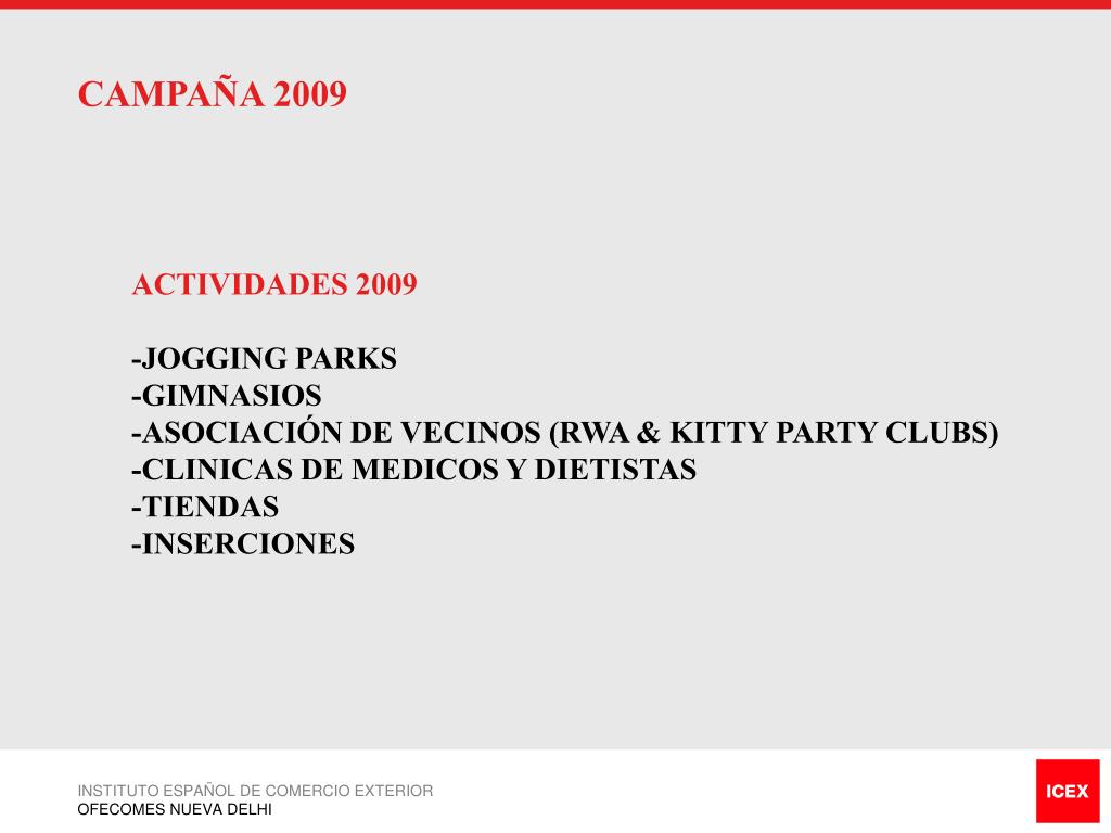 CAMPAÑA 2009 ACTIVIDADES 2009 -JOGGING PARKS -GIMNASIOS -ASOCIACIÓN DE VECINOS (RWA & KITTY PARTY CLUBS) -CLINICAS DE MEDICOS Y DIETISTAS -TIENDAS -INSERCIONES INSTITUTO ESPAÑOL DE COMERCIO EXTERIOR OFECOMES NUEVA DELHI