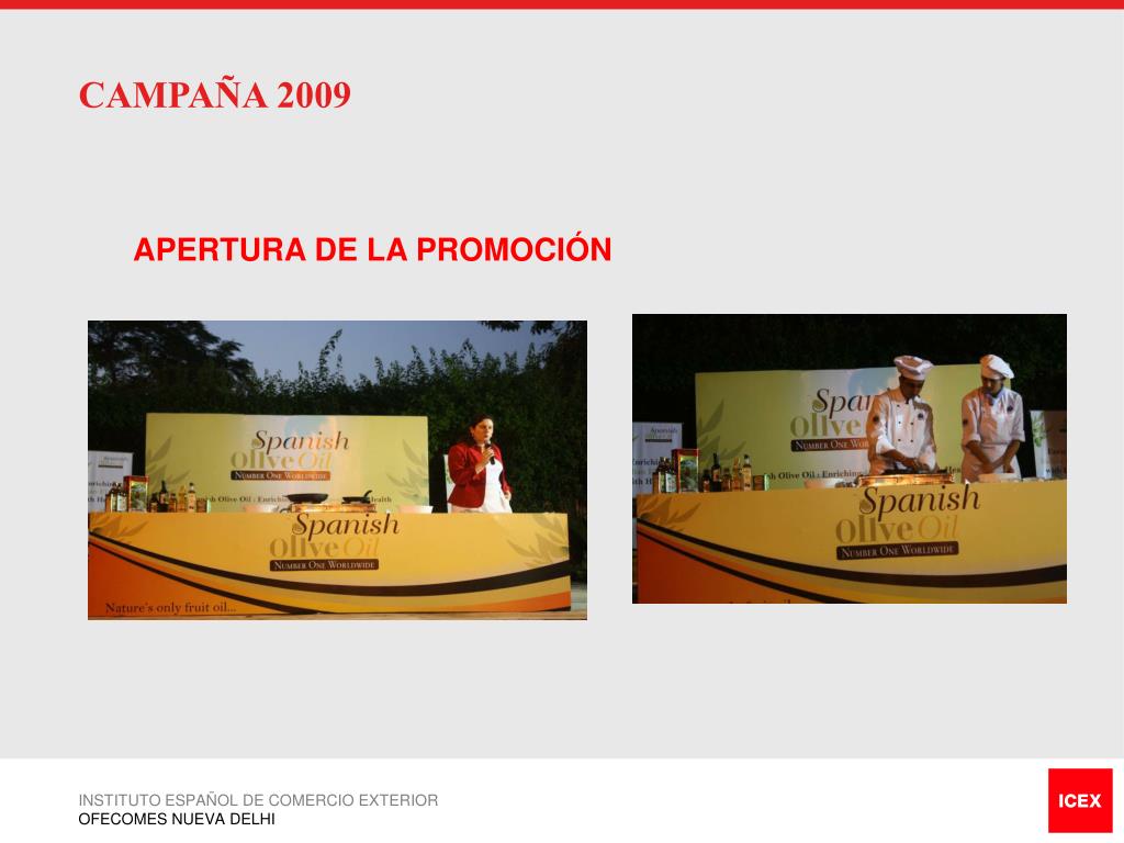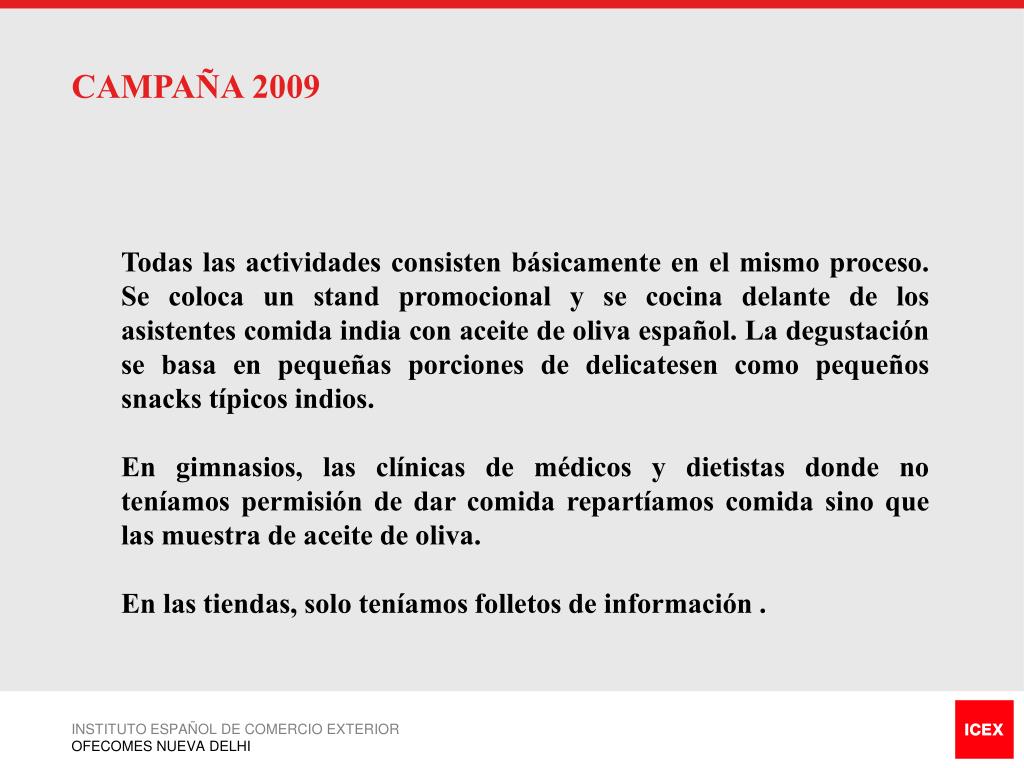 CAMPAÑA 2009 Todas las actividades consisten básicamente en el mismo proceso. Se coloca un stand promocional y se cocina delante de los asistentes comida india con aceite de oliva español. La degustación se basa en pequeñas porciones de delicatesen como pequeños snacks típicos indios. En gimnasios, las clínicas de médicos y dietistas donde no teníamos permisión de dar comida repartíamos comida sino que las muestra de aceite de oliva. En las tiendas, solo teníamos folletos de información . INSTITUTO ESPAÑOL DE COMERCIO EXTERIOR OFECOMES NUEVA DELHI
