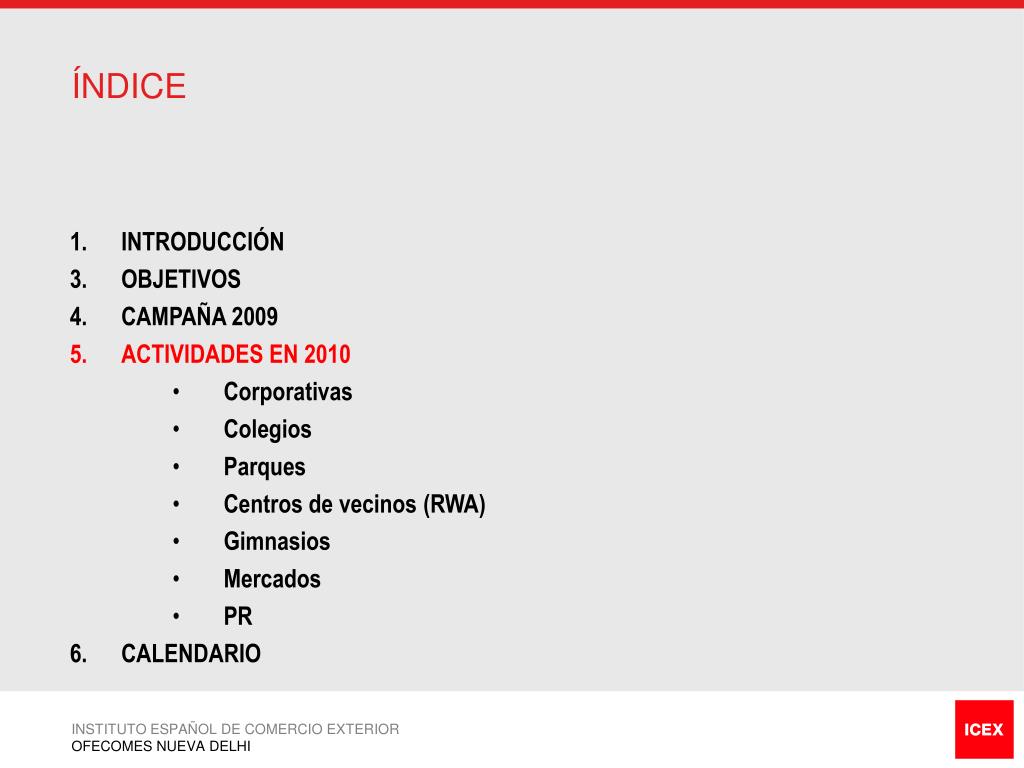 ÍNDICE • INTRODUCCIÓN • OBJETIVOS • CAMPAÑA 2009 • ACTIVIDADES EN 2010 • Corporativas • Colegios • Parques • Centros de vecinos (RWA) • Gimnasios • Mercados • PR • CALENDARIO INSTITUTO ESPAÑOL DE COMERCIO EXTERIOR OFECOMES NUEVA DELHI