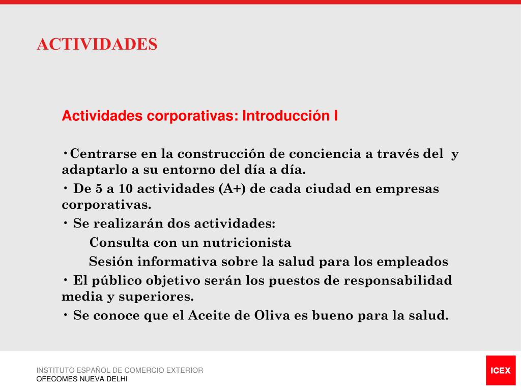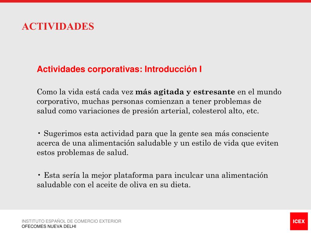ACTIVIDADES • Actividades corporativas: Introducción I • Centrarse en la construcción de conciencia a través del y adaptarlo a su entorno del día a día. • De 5 a 10 actividades (A+) de cada ciudad en empresas corporativas. • Se realizarán dos actividades: Consulta con un nutricionista Sesión informativa sobre la salud para los empleados • El público objetivo serán los puestos de responsabilidad media y superiores. • Se conoce que el Aceite de Oliva es bueno para la salud. INSTITUTO ESPAÑOL DE COMERCIO EXTERIOR OFECOMES NUEVA DELHI